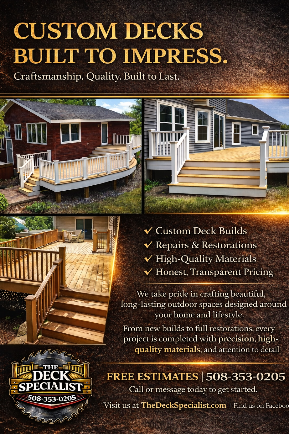 From new decks to rebuilds and repairs, The Deck Specialist combines expert craftsmanship with transparent pricing for results you'll enjoy for years.